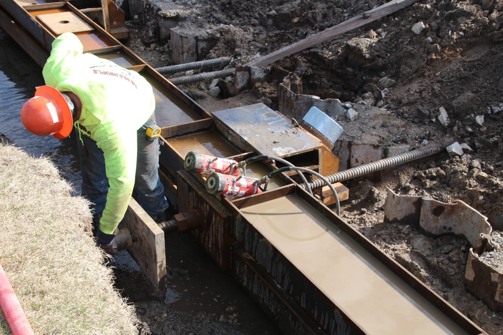 Two PowerX High-Pressure Hydraulic Cylinders being used to repair a pier on Lake Michigan.